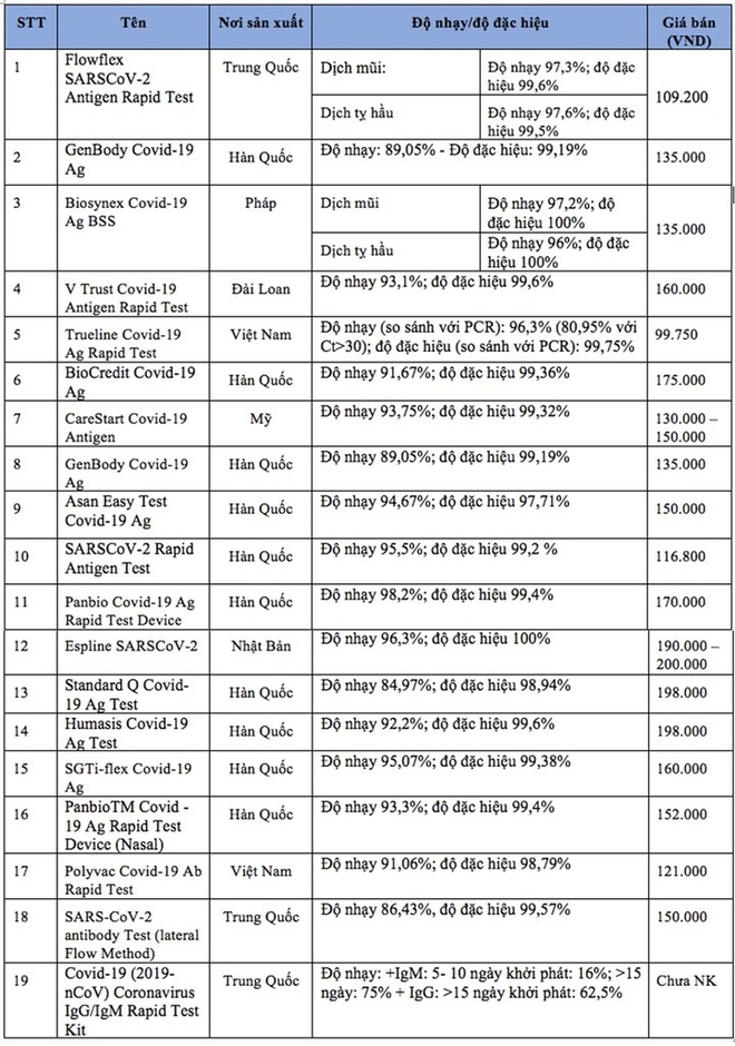 Danh sách 19 test nhanh kháng nguyên được Bộ Y tế cấp phép. Ảnh: Zing.vn.