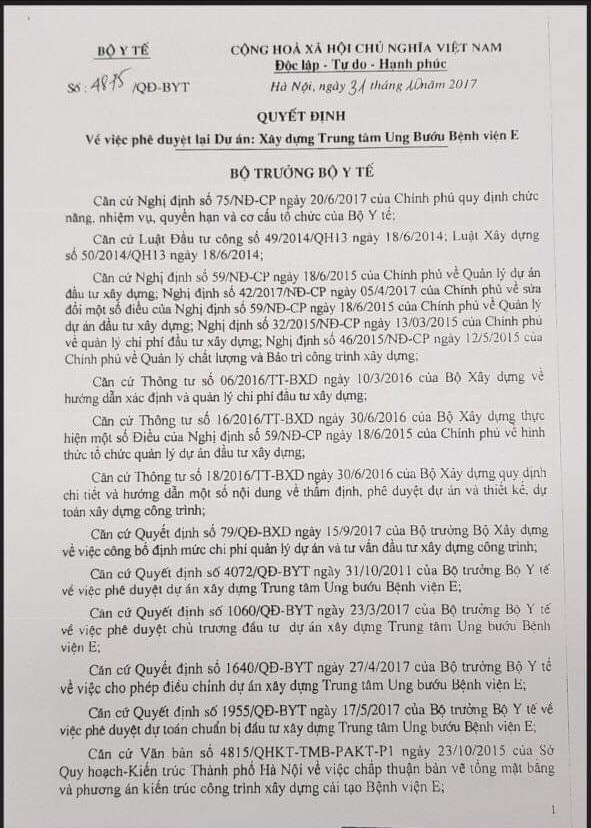 Dự án Trung tâm Ung bướu - Bệnh viện E được Bộ trưởng Bộ Y tế Nguyễn Thị Kim Tiến phê duyệt ngày 31/10/2017 bằng quyết định số 4875/QĐ-BYT. Căn cứ pháp lý để Bộ trưởng Tiến dẫn nguồn ký quyết định phê duyệt dự án là Nghị định số 75/NĐ-CP ngày 20/6/2017 của Chính phủ quy định chức năng, nhiệm vụ, quyền hạn và cơ cấu tổ chức của Bộ Y tế; Luật Đấu thầu, Luật Xây dựng, Nghị định 59/2015/NĐ-CP, Nghị định 42/2017/NĐ-CP, Nghị định 32/2015/NĐ-CP, Nghị định 46/2015/NĐ-CP và hàng loạt Thông tư, Quyết định liên quan khác.