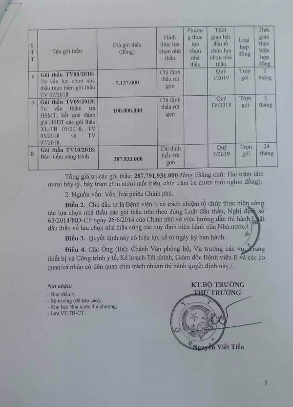 | Quyết định của Thứ trưởng Bộ Y tế Nguyễn Viết Tiến cho phép Bệnh viện E “tổ chức thực hiện công tác lựa chọn nhà thầu” gói thầu trị giá hơn 287 tỷ đồng. |