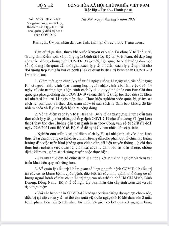Bộ Y tế đã ra văn bản số 5599/BYT- MT ngày 14/7/2021 gửi Ủy ban nhân dân các tỉnh, thành phố trực thuộc Trung ương về việc giảm thời gian cách ly, thí điểm cách ly y tế F1 tại nhà, quản lý điều trị bệnh nhân Covid-19.