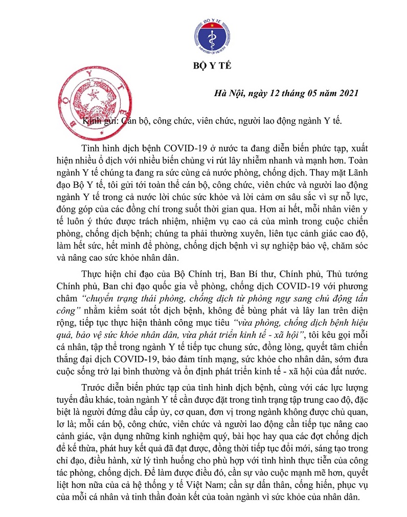 Ngày 12/5, GS.TS Nguyễn Thanh Long- Bộ trưởng Bộ Y tế đã có thư gửi các cán bộ, công chức, viên chức và người lao động trong ngành y tế kêu gọi toàn ngành tiếp tục chung sức, đồng lòng, quyết tâm chiến thắng đại dịch Covid-19.