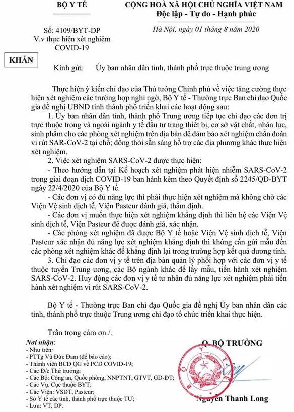 Ngày 1/8, GS.TS Nguyễn Thanh Long - Quyền Bộ trưởng Bộ Y tế đã ký công văn khẩn số 4109/BYT-DP gửi UBND tỉnh, thành phố trực thuộc Trung ương về việc thực hiện xét nghiệm COVID-19.