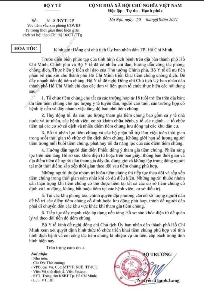 Bộ trưởng Bộ Y tế Nguyễn Thanh Long đã ký văn bản hoả tốc số 6118/BYT-DP ngày 29/7/2021 gửi UBND TP Hồ Chí Minh về tiêm chủng vắc xin Covid-19 trong thời thực hiện giãn cách xã hội theo Chỉ thị 16/CT-TTg, theo đó đồng ý để Thành phố sắp xếp thời gian theo dõi sau tiêm chủng phù hợp đảm bảo an toàn.