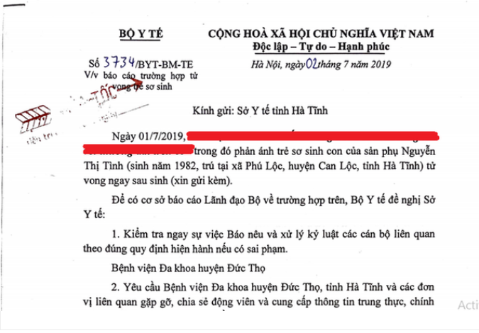 Bộ Y tế vừa có công văn khẩn yêu cầu Sở Y tế Hà Tĩnh làm rõ trường hợp trẻ sơ sinh tử vong tại Bệnh viện Đa khoa huyện Đức Thọ.