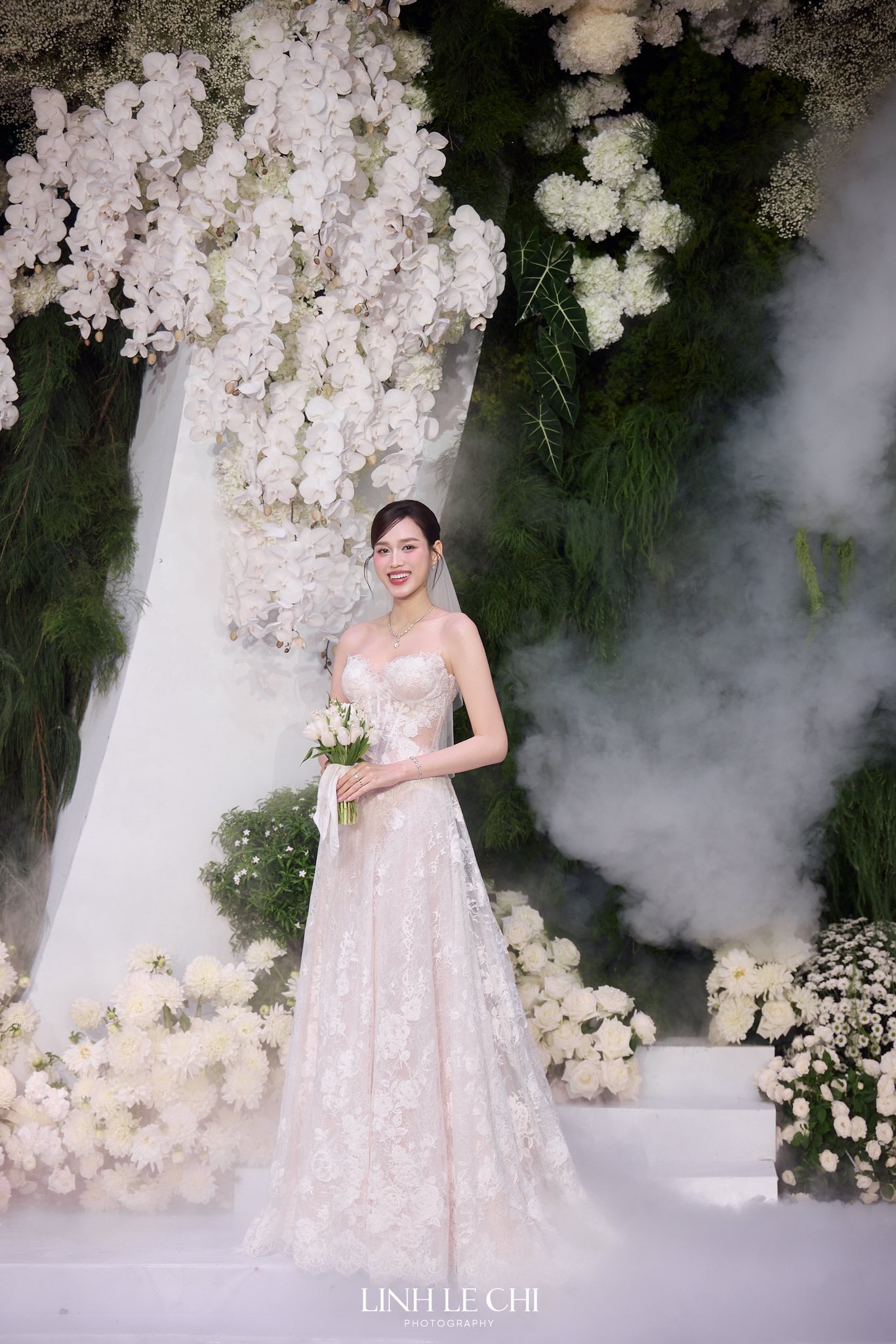Bó hoa cưới không chỉ là phụ kiện mà là chi tiết nâng tầm đám cưới của cặp đôi. Theo đó, hoa cưới cô dâu Đỗ Thị Hà cầm gồm hai loài hoa đắt đỏ bậc nhất thế giới chính là linh lan và tulip. Tulip trắng mang vẻ hiện đại, thanh lịch; linh lan mang nét cổ điển, quý phái và có giá trị cao trong các đám cưới hàng đầu.