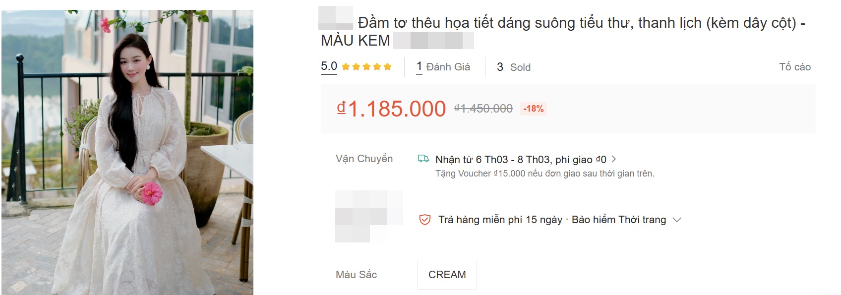 Chiếc váy màu trắng có chất liệu tơ, thêu họa tiết hoa. Dáng váy dài gần đến mắt cá chân, xòe phom rộng 2 tầng, che khuyết điểm rất tốt, đặc biệt là với những chị em muốn giấu vòng 2 lớn.