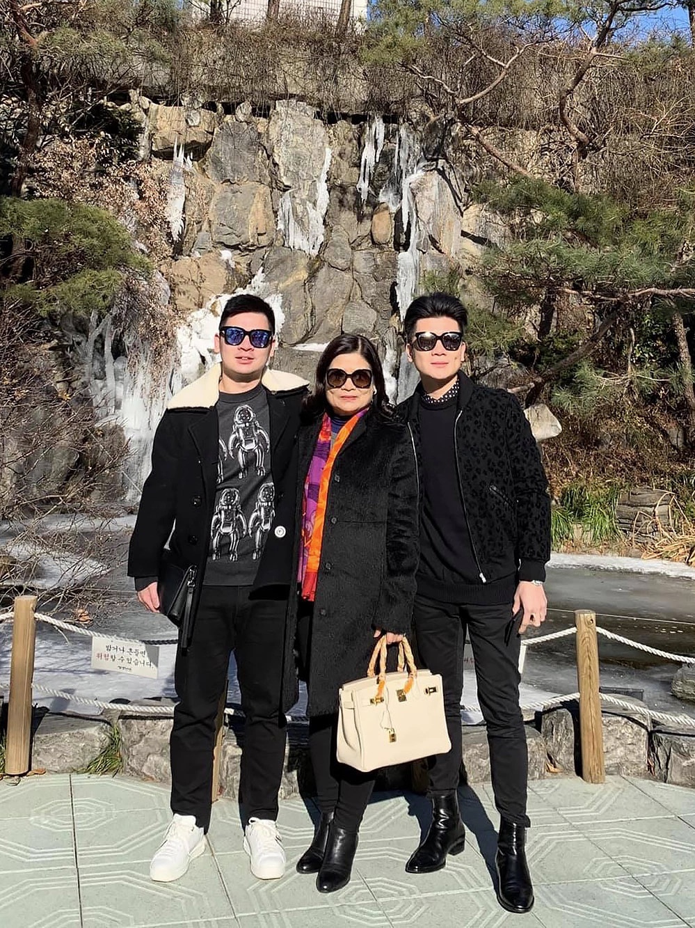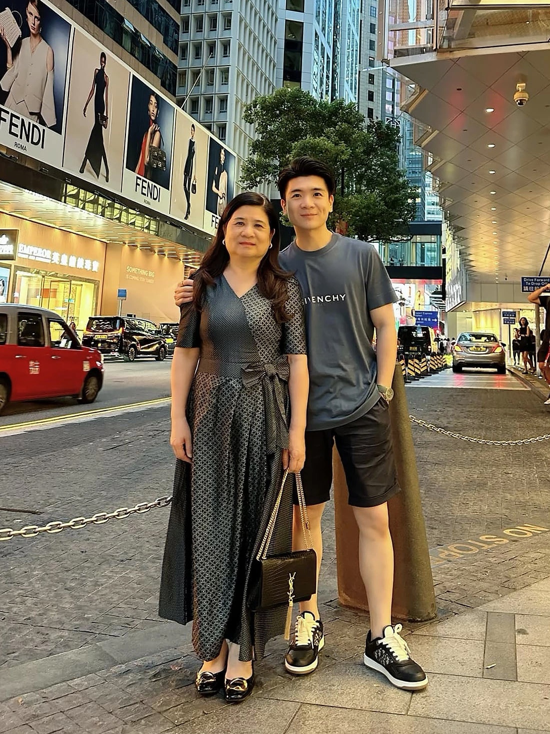 Quý bà 6X chọn túi Saint Laurent họa tiết da cá sấu giá gần 80 triệu đồng khi chụp hình cùng con trai lớn.
