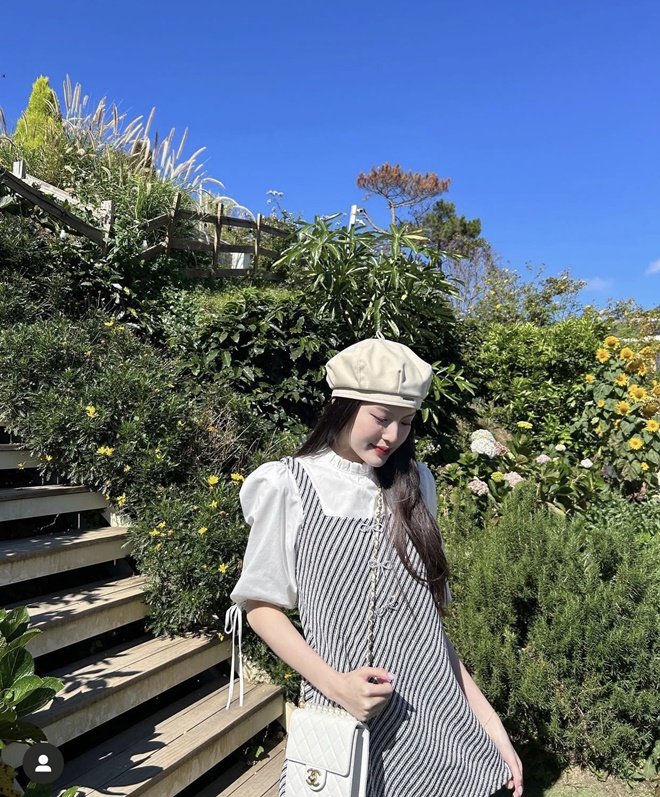 Phong cách thời trang mang đậm tinh thần "preppy" pha chút Lolita hiện đại, tạo nên tổng thể trẻ trung, tinh nghịch nhưng vẫn giữ được nét duyên dáng và chỉn chu cho người đẹp. Chiếc túi mini dáng hộp đen với dây xích ánh kim và chi tiết ngọc trai nhỏ từ nhà mốt Chanel góp phần tô điểm cho outfit thêm sang xịn.