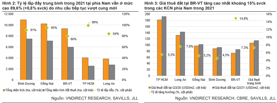"Bên cạnh đó, chúng tôi tin rằng nhà kho và nhà xưởng xây sẵn sẽ tiếp tục thu hút trong năm 2022 với việc hàng loạt các chủ đầu tư cả trong nước và nước ngoài đang tìm kiếm cơ hội gia nhập vào thị trường này. CBRE dự báo tăng trưởng kép của nguồn cung mới nhà kho/nhà xưởng xây sẵn lần lượt là 22%/14% ở phía Nam và 46%/10% tại phía Bắc trong giai đoạn 2021-23" - báo cáo của VNDirect nhận định.