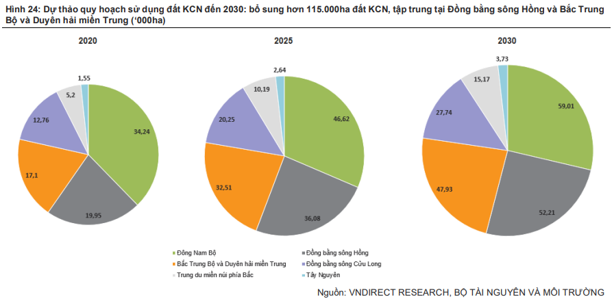 Cuối cùng, đẩy mạnh mở rộng nguồn cung mới tại Đồng bằng sông Hồng và Bắc Trung Bộ và Duyên hải miền Trung. Nguồn cung đất KCN Việt Nam đang được đẩy mạnh mở rộng hơn 44.760ha trong 2022-25 để nắm bắt nhu cầu thuê đất KCN đang ngày càng mạnh mẽ, trong đó sẽ tập trung mở rộng tại Đồng bằng sông Hồng, Bắc Trung Bộ và Duyên hải miền Trung.