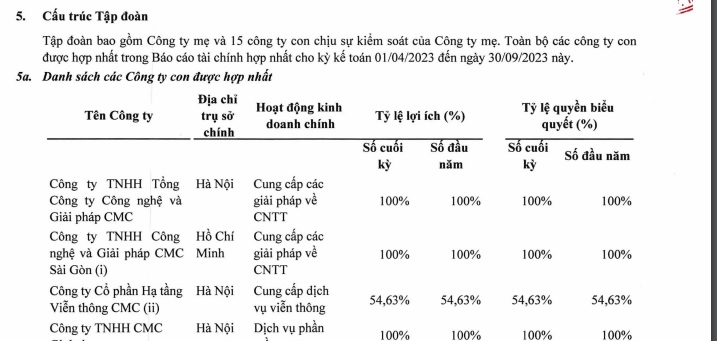 Về hệ sinh thái: Theo Báo cáo tài chính (BCTC) hợp nhất ngày 30/9/2023, Tập đoàn CMC hiện có 15 công ty con và công ty liên kết bao gồm: Công ty TNHH Tổng Công ty Công nghệ và Giải pháp CMC (CMC TS). Công ty TNHH CMC Education. Công ty THNH CMC Global. Công ty TNHH CMC Đà Nẵng. Công ty TNHH Công nghệ và Giải pháp CMC Sài Gòn. Công ty TNHH Sản xuất và Dịch vụ CMC. Công ty TNHH An ninh An toàn Thông tin CMC. Viện nghiên cứu ứng dụng công nghệ CMC. CTCP CMC Japan. Công ty TNHH CMC Châu Á Thái Bình Dương. Trường Đại học Mỹ thuật Công nghiệp Á Châu. CTCP Hạ tầng Viễn thông CMC và Công ty Cổ phần Đầu tư Đại học CMC.