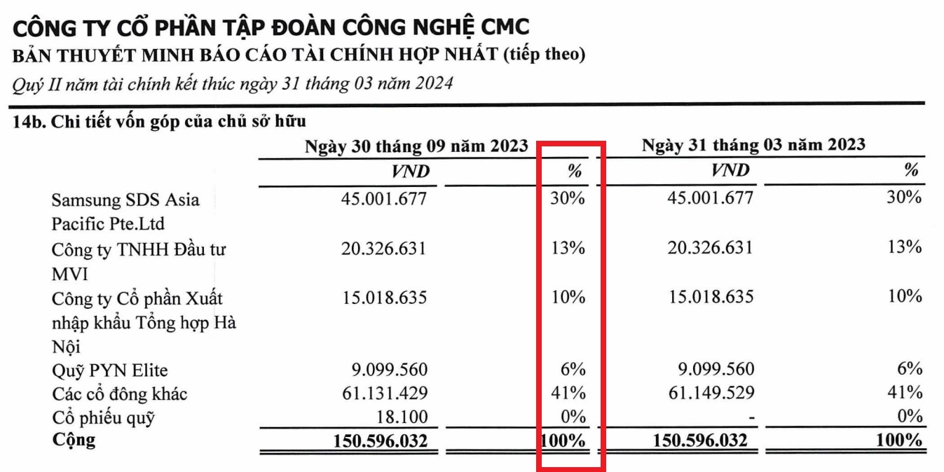 BCTC hợp nhất của Tập đoàn CMC tại ngày 30/9 cho thấy. Cơ cấu cổ đông gồm: Sasmung SDS Asia Pacific Pte Ltd nắm 30% cổ phần. Công ty TNHH Đầu tư MVI nắm 13% cổ phần. CTCP Xuất nhập khẩu Tổng hợp Hà Nội nắm (Geleximco) 10% cổ phần. Quỹ Pyn Elite Fund (Non - Ucits) nắm 6% cổ phần. Các cổ đông khác nắm 41% cổ phần.