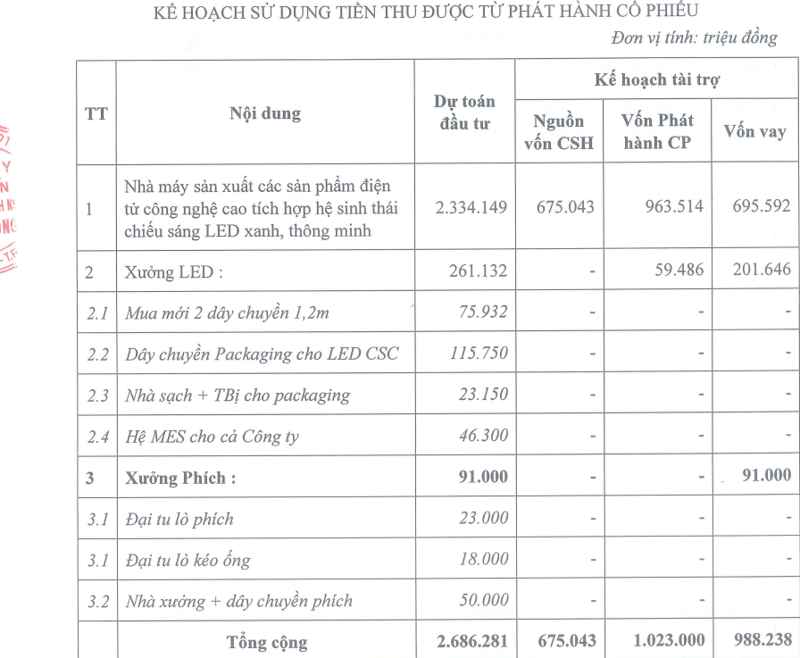 Tổng số tiền dự kiến thu được từ đợt phát hành là 1.023 tỷ đồng. Trong đó, 963,5 tỷ đồng đầu tư nhà máy sản xuất các sản phẩm điện tử công nghệ cao tích hợp hệ sinh thái chiếu sáng LED xanh, thông minh; và 59,49 tỷ đồng đầu tư xưởng LED.