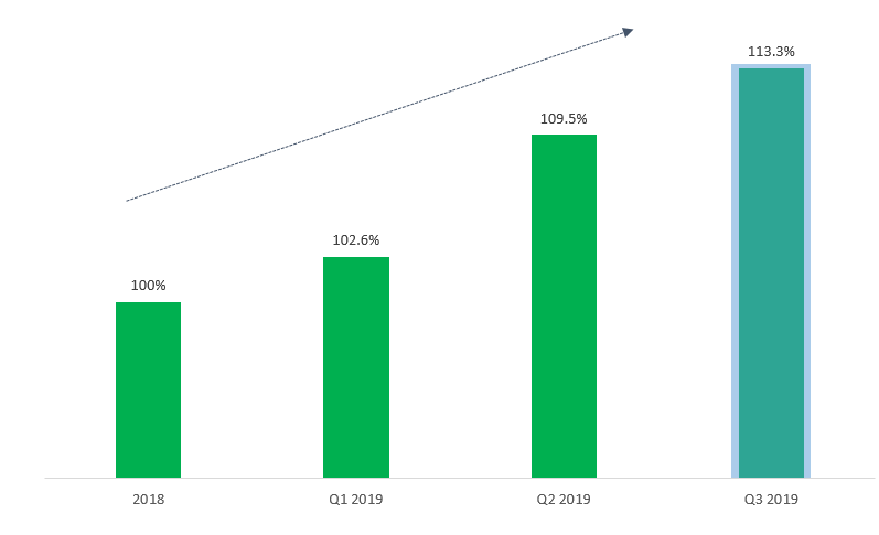 Quý 3 ghi dấu những nỗ lực của FE CREDIT trong việc hoàn thành kế hoạch tăng trưởng bền vững và tuân thủ mục tiêu tăng trưởng tín dụng 13,75% của Ngân hàng Nhà nước trong năm 2019. Kết quả nhờ sự tăng trưởng đồng bộ và ổn định của các phân khúc sản phẩm chính. So với quý trước, doanh số bán chéo và bán thêm tăng trưởng gần 5%. Bên cạnh đóng góp từ mảng khách hàng hiện hữu, danh mục khách hàng mới cũng góp phần không nhỏ vào tăng trưởng chung của quý 3.