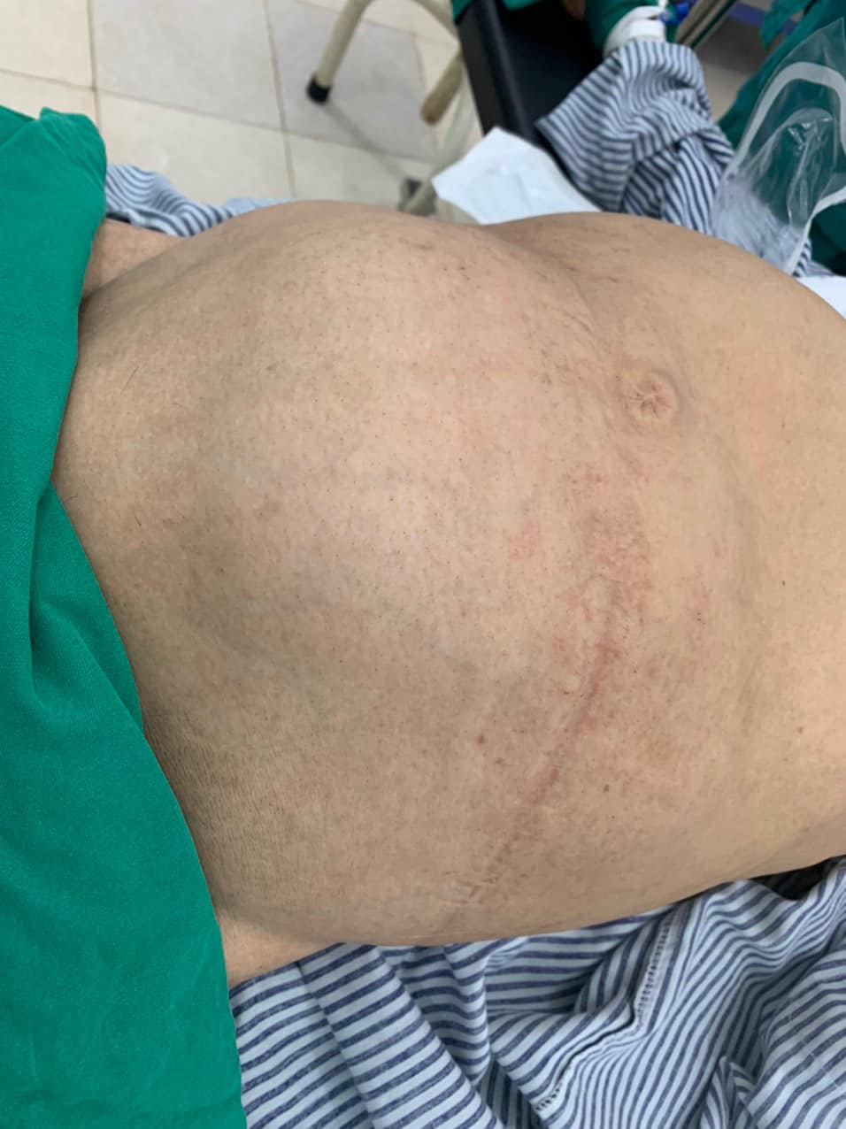 Sau khi thăm khám và dựa trên kết quả Siêu âm, Bác sĩ điều trị thấy Ổ bụng có khối u kích thước rất lớn, choán hết ổ bụng. Kết quả siêu âm: Hình ảnh khối u kích thước lớn, không quan sát được các cơ quan khác trong ổ bụng.