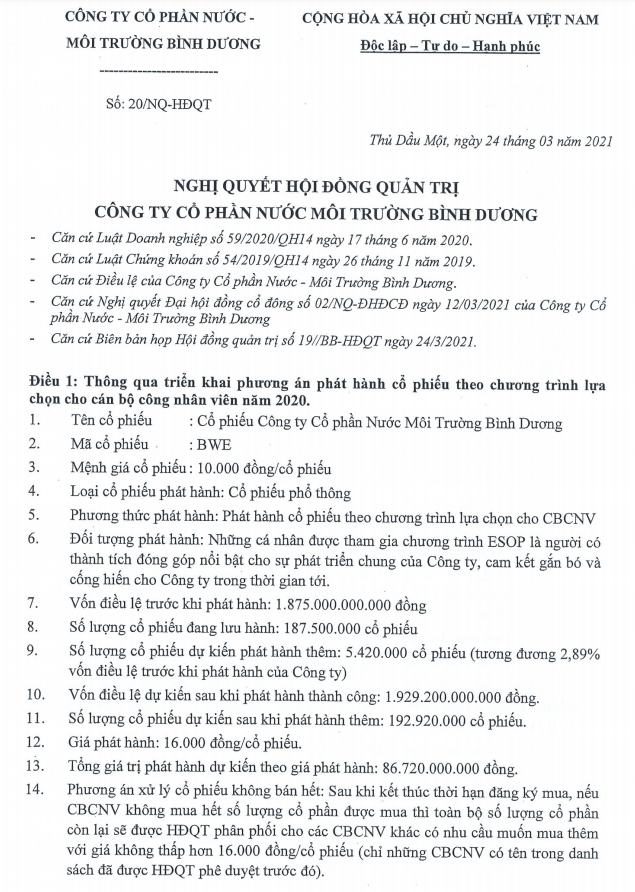 CTCP Nước - Môi trường Bình Dương (Biwase, MCK: BWE) lên kế hoạch phát hành 5,42 triệu cổ phiếu ESOP với giá 16.000 đồng.