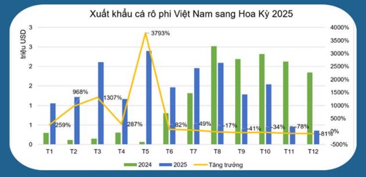 Theo Hiệp hội Chế biến và Xuất khẩu thủy sản Việt Nam (VASEP), năm 2025, xuất khẩu cá rô phi Việt Nam sang Mỹ đạt 53,15 triệu USD, tăng 173% so với năm 2024 và chiếm 54% tổng kim ngạch xuất khẩu cá rô phi của cả nước. Mỹ chính thức vượt các thị trường truyền thống để trở thành điểm đến lớn nhất của cá rô phi Việt Nam.