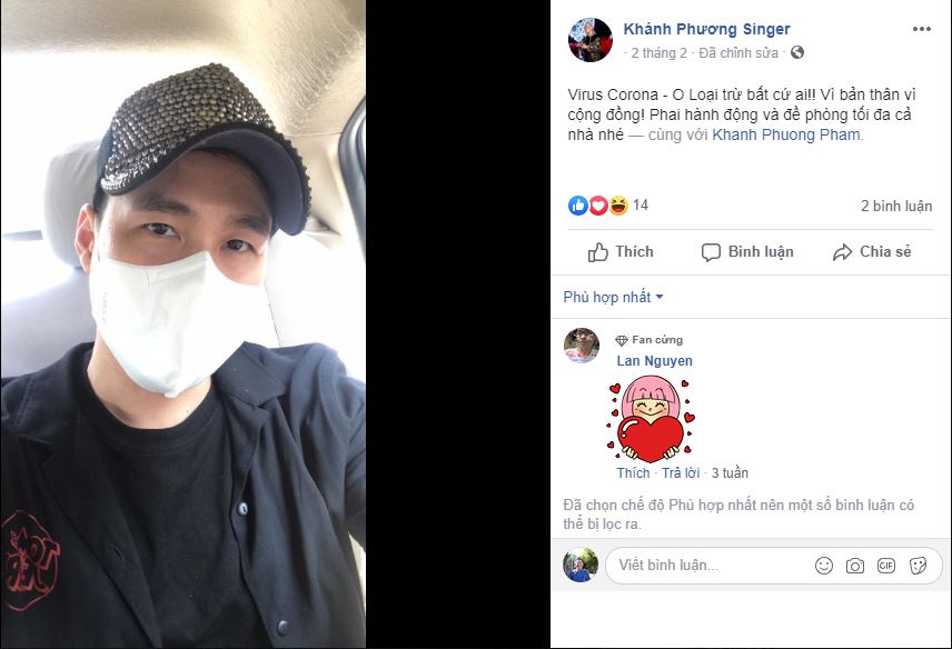 Ca sĩ Khánh Phương là một trong những nghệ sĩ đầu tiên và tích cực nhất trong việc kêu gọi mọi người tuân thủ chặt chẽ các yêu cầu của Chính phủ và Bộ Y tế để phòng tránh các nguy cơ lây nhiễm tác nhân gây bệnh nguy hại.