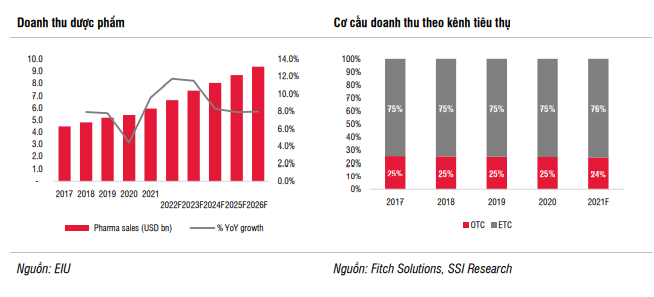 Theo Economist Intelligence Unit (EIU), doanh thu dược phẩm tại Việt Nam đạt 5,9 tỷ USD (tăng 9,6% so với cùng kỳ) vào năm 2021. Trong giai đoạn 2017 - 2021, doanh thu dược phẩm tăng trưởng với tốc độ CAGR là 7,4%. EIU dự báo tốc độ tăng CAGR là 9,5% trong 5 năm tới, do chi tiêu cho các sản phẩm liên quan đến sức khỏe sẽ tăng cùng với thu nhập người dân tăng lên. Xét theo từng kênh, kênh ETC (thuốc điều trị/thuốc kê đơn, có thể được sử dụng làm đại diện cho kênh bệnh viện) đóng góp khoảng 75 đến 76% tổng doanh thu trong 5 năm qua.