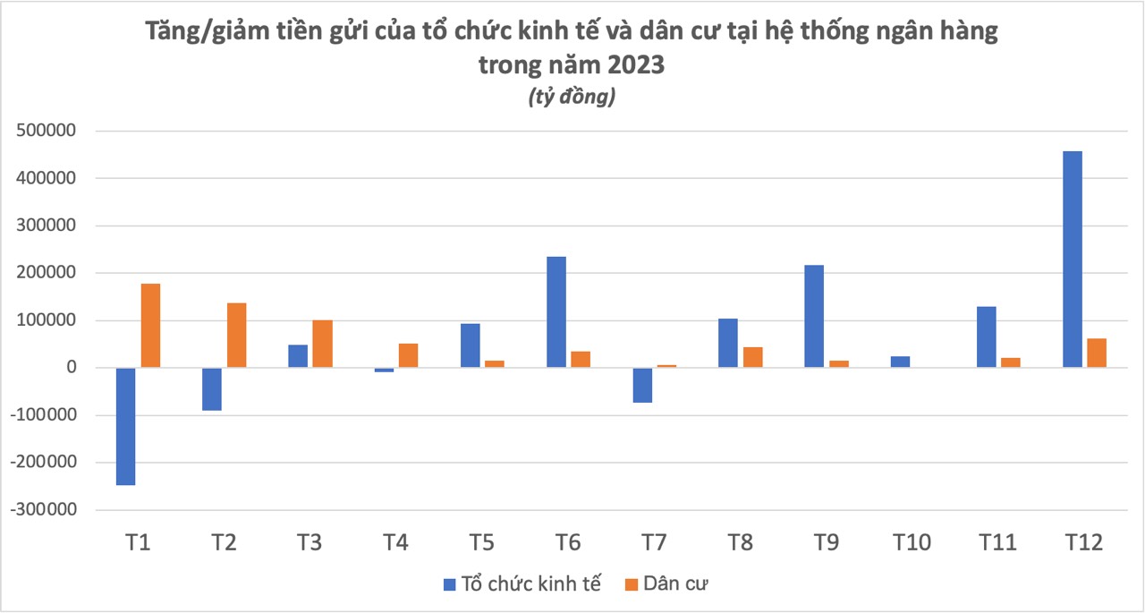Đáng chú ý, tháng cuối cùng 12/2023, tiền gửi của tổ chức kinh tế tăng đột biến từ 6,38 triệu tỷ đồng lên 6,84 triệu tỷ đồng, tức tăng tới hơn 457 nghìn tỷ đồng. Đây là mức tăng hàng tháng mạnh nhất được ghi nhận từ trước đến nay, hơn cả giai đoạn Covid-19.