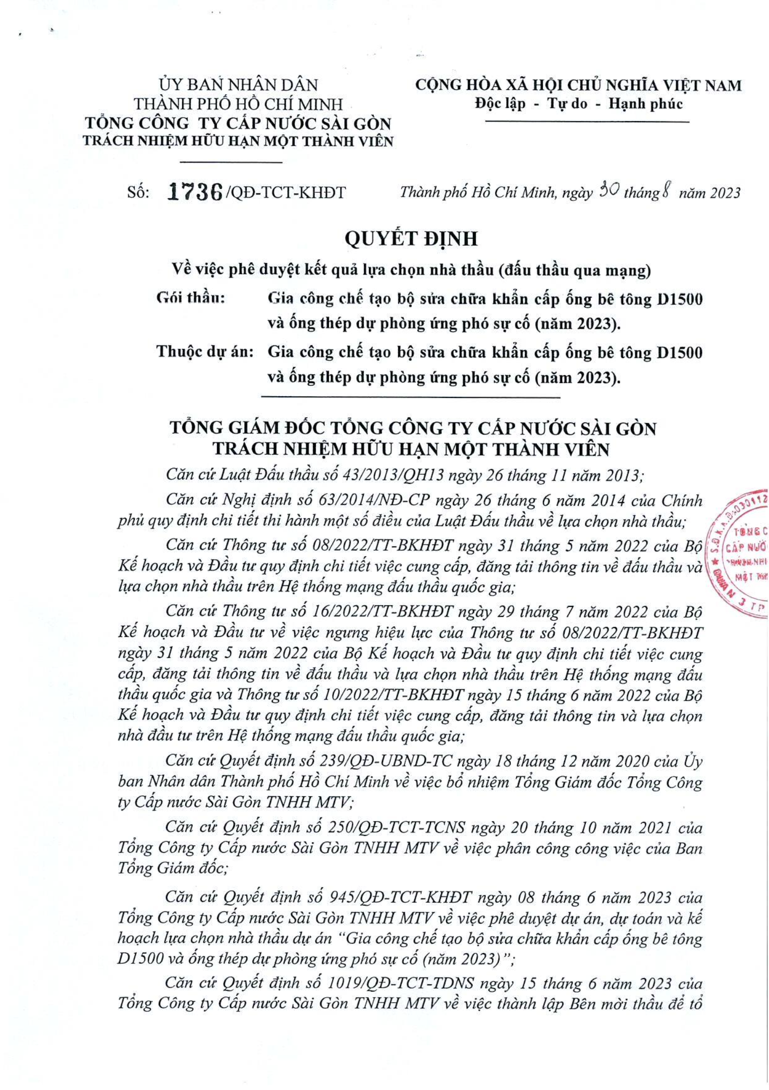 Tổng công ty Cấp nước Sài Gòn – TNHH MTV vừacó Quyết định 757/QĐ-TCT-QLDA1 phê duyệt kếtquả lựa chọn nhà thầu gói cung cấp vật tư và thi côngxây dựng, thuộc Dự án lắp đặt tuyến ống cấp 1 đường Nguyễn Văn Linh, quận 7, 8, huyện BìnhChánh (từ Hương Lộ 34 đến Quốc Lộ 1A).