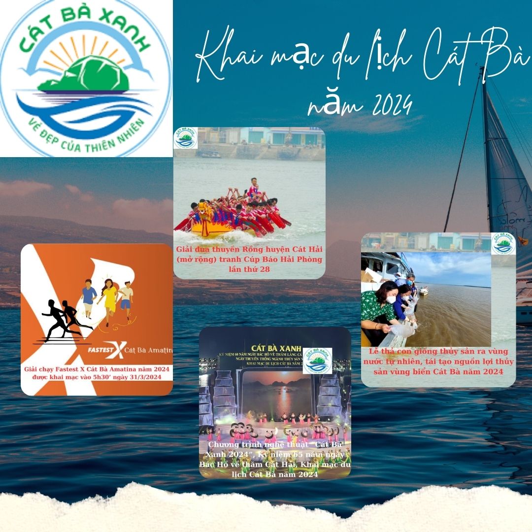 10. Chương trình nghệ thuật “Cát Bà Xanh 2024”, Kỷ niệm 65 năm ngày Bác Hồ về thăm Cát Hải, Khai mạc du lịch Cát Bà năm 2024 tổ chức vào 20h15’ ngày 31/3/2024 tại Sân khấu trung tâm du lịch Cát Bà. Chương trình gồm 3 chương: Hải Phòng thành phố tôi yêu; Cát Hải-In dấu chân Người; Cát Bà-Điểm hẹn bốn mùa.