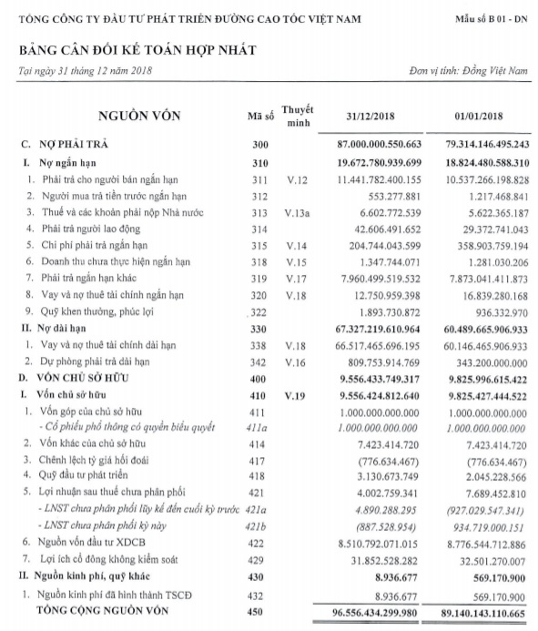 Tính đến hết năm 2018, nợ phải trả của VEC là 87.000 tỷ đồng.Đáng chú ý, cũng tính đến hết năm 2018, nợ phải trả của VEC là 87.000 tỷ đồng. Trong đó, nợ ngắn hạn là 19.672 tỷ đồng và nợ dài hạn 67.327 tỷ đồng (chủ yếu là vay và nợ thuê tài chính). Trong khi đó, cùng thời điểm, vốn chủ sở hữu của VEC chỉ 9.556 tỷ đồng.