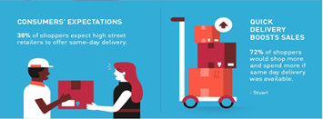 Theo Stuart Logistics, 72% khách hàng cho biết họ sẽ mua nhiều lần và chi tiêu nhiều hơn nếu được giao hàng trong ngày. Tuy nhiên, không phải nhà bán lẻ nào cũng đáp ứng được yêu cầu này do các bất cập và khó khăn về logistics và chuỗi cung ứng, nhất là trong thời buổi đại dịch Covid-19.