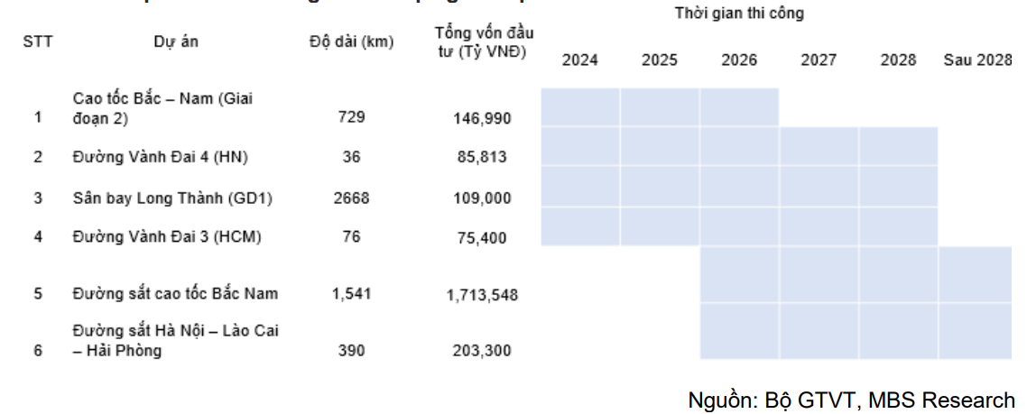 Trong giai đoạn 2025 -2027 các dự án chiến lược, có vốn đầu tư lớn nhằm nâng cao hạ tầng giao thông có thể đẩy mạnh triển khai như cao tốc Bắc – Nam GD2 (146,990 tỷ VNĐ), sân bay Long Thành GD1 (109,000 tỷ VNĐ) và đường Vành đai 4 (85,000 tỷ VNĐ). Sau năm 2027, dự án đường sắt cao tốc Bắc – Nam (1.7 triệu tỷ VNĐ) và đường sắt cao tốc Lào Cai – Hà Nội – Hải Phòng kì vọng có thể khởi công và trở thành động lực tăng trưởng mới đối với giải ngân ĐTC giai đoạn sau 2027.