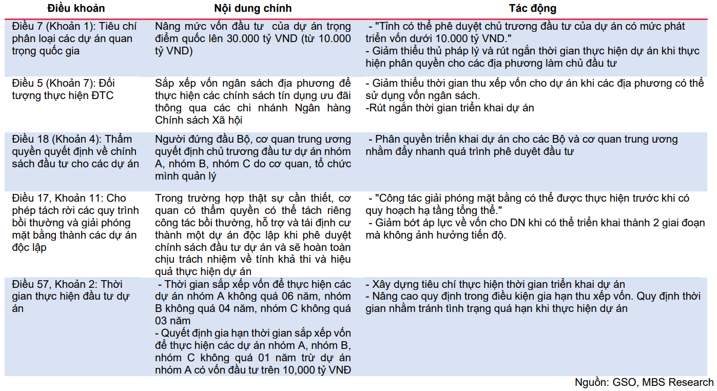 MBS đánh giá, khi Luật Đầu tư công (sửa đổi) có hiệu lực từ tháng 1/2025 có thể tạo điều kiện nhằm đẩy nhanh quá trình giải ngân vốn đầu tư công. Các điều chỉnh của Luật hướng tới việc đẩy nhanh quá trình thực hiện vốn đầu tư công tại các Bộ ngành và địa phương. Những thay đổi này dự kiến có thể góp phần rút ngắn thời gian triển khai các dự án đầu tư khi phân quyền cho các địa phương và Bộ ngành có thể giải quyết các bước quan trọng trong việc xây dựng dự án như Chủ trương đầu tư, thu xếp vốn…