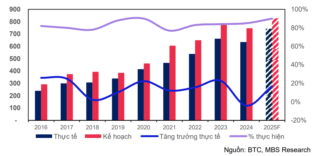 MBS nhấn mạnh rằng năm 2025 trở thành năm chiến lược để hoàn thành dự án đầu tư công trong giai đoạn 2025 - 2027. Nguồn vốn giải ngân đầu tư công dự kiến tăng trưởng 18% so với cùng kỳ lên mức 743,330 tỷ VNĐ (tương đương 90% mục tiêu của Chính phủ) với 2 yếu tố hỗ trợ quan trọng đến từ các dự án chiến lược có thể hoàn tất trong năm nay và vướng mắc liên quan đến đền bù, GPMB và vấn đề thiếu nguyên vật liệu có thể được giải quyết.