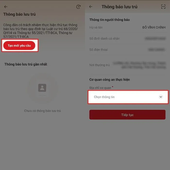 Bước 4: Chọn Loại hình cơ sở lưu trú của mình trong phần Thông tin lưu trú. Điền đầy đủ các trường thông tin được yêu cầu (các mục có dấu chấm màu đỏ là mục bắt buộc phải điền thông tin, không được bỏ trống). Nhấn tiếp tục để đăng ký tạm trú.