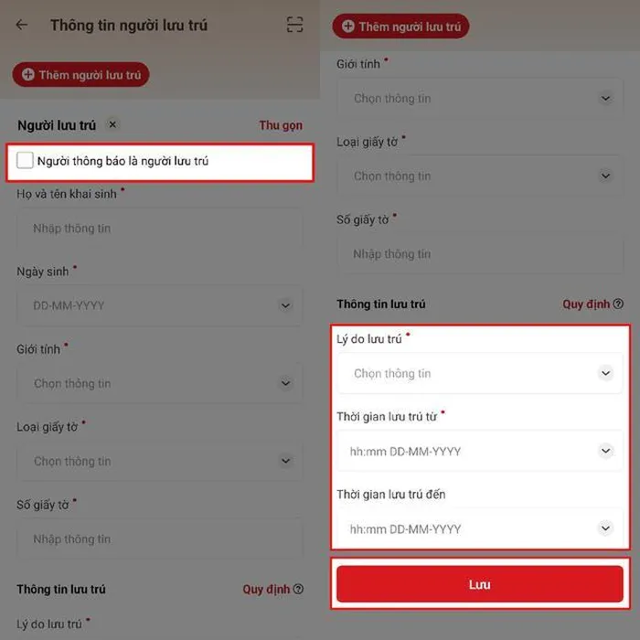 Bước 6: Tại mục này bạn hãy tích vào ô Người thông báo là người lưu trú. Kéo xuống dưới và điền đầy đủ các Thông tin lưu trú. Cuối cùng, ấn nút Lưu là hoàn thành.