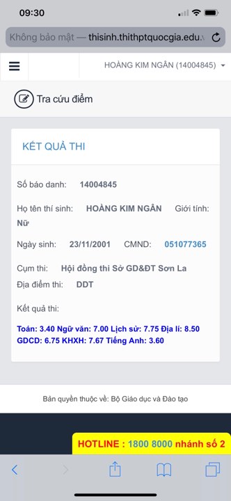 Sau khi thực hiện tra cứu, kết quả thi của thí sinh sẽ hiện như dưới hình: