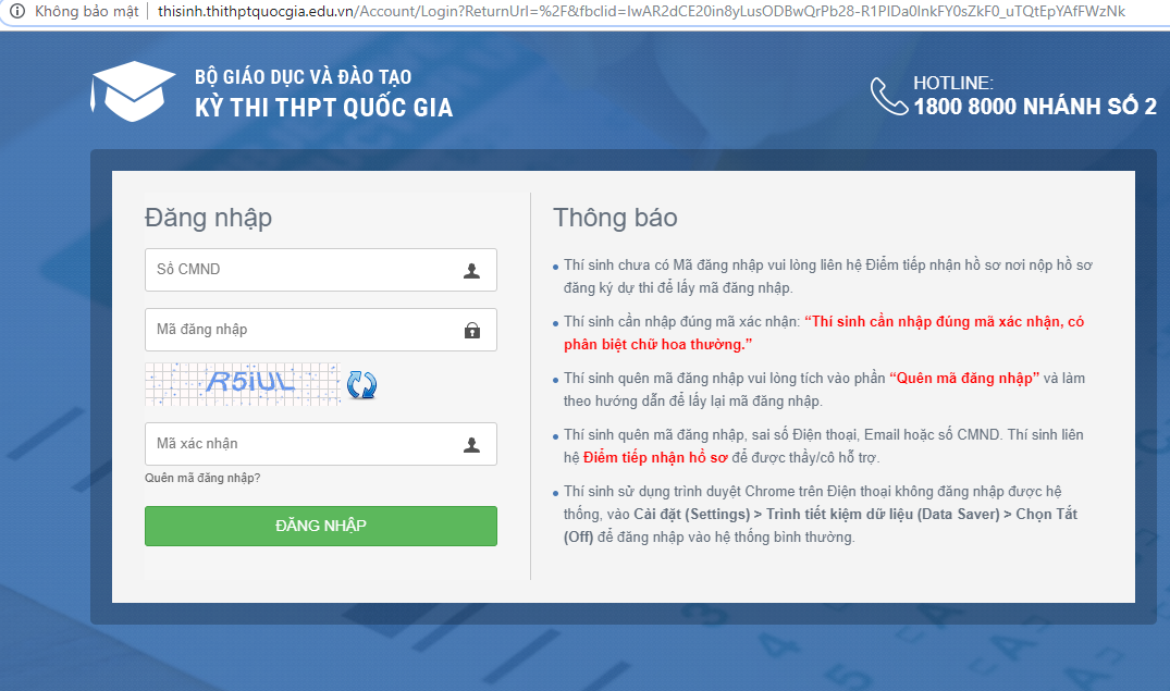 Cách thứ nhất, truy cập đường linkhttp://thisinh.thithptquocgia.edu.vn, sau đó nhập các dữ liệu số CMTND, mã đăng nhập và mã xác nhận để tra cứu điểm thi.
