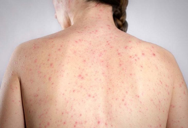 - Toàn thân nổi nhiều nốt mụn nước hình tròn, ngứa ngáy.