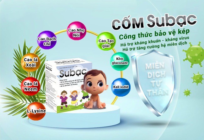 Hiện nay trên thị trường có rất nhiều sản phẩm tăng cường sức đề kháng, nhưng cốm Subạc là sản phẩm nổi trội, chứa thành phần từ thảo dược như cao lá neem, cao lá xoài, cao nhọ nồi, kẽm gluconate, cao bạch chỉ, L-lysine,... giúp tăng cường sức đề kháng, phòng ngừa lây nhiễm virus thủy đậu. Đồng thời hỗ trợ làm lành vết thương một cách nhanh chóng, giảm nhẹ triệu chứng trong trường hợp chẳng may đã bị lây bệnh.