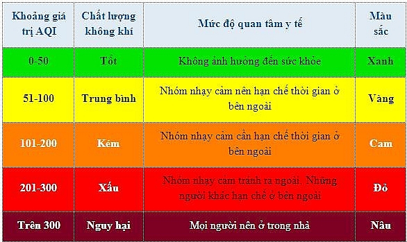 Trên thế giới, đa số các quốc gia đều sử dụng bảng đo AQI (giá trị chỉ số chất lượng không khí) chia thành 6 bậc, tương ứng với 6 màu, từ màu xanh là mức tốt (AQI từ 0 - 50) đến màu nâu là mức nguy hại (301 - 500). Như vậy, theo đề xuất mới của Tổng cục Môi trường, có thể khi chỉ số AQI tại một địa phương, vùng lãnh thổ chạm ngưỡng màu nâu thì cần công bố tình trạng khẩn cấp và tiến hành ngay các biện pháp giảm ô nhiễm.