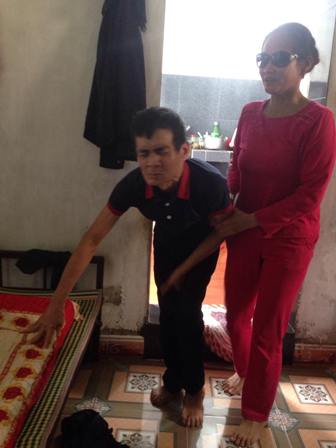 Chị Nguyễn Thị Nhụ mắt kém giúp anh trai Nguyễn Văn Dũng đi lại