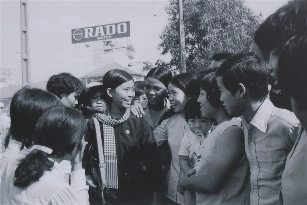 | Nam nữ thanh niên Sài Gòn chào đón các chiến sĩ tự vệ vào giải phóng thành phố. |