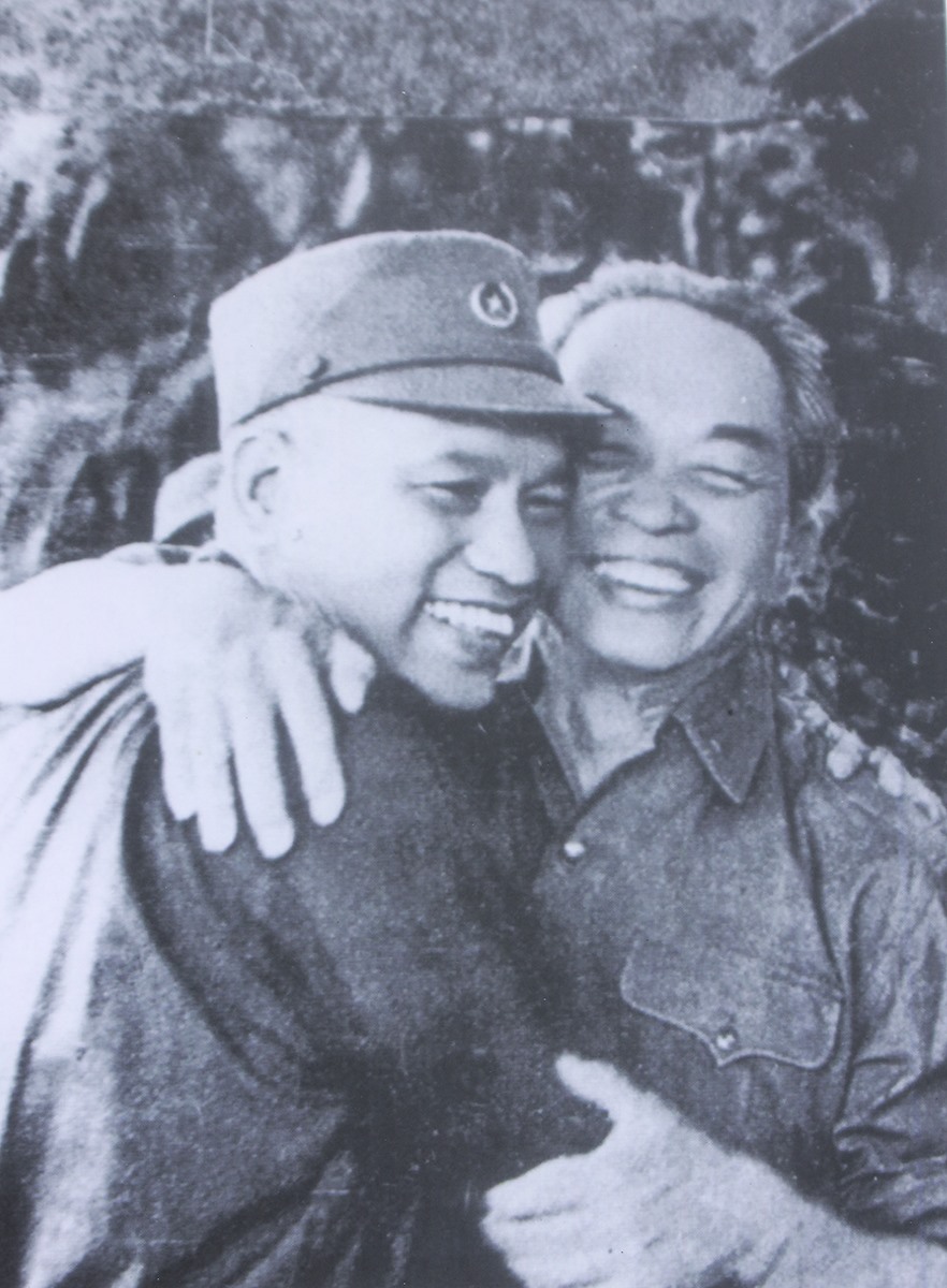 | Đại tướng Võ Nguyên Giáp và Đại tướng Văn Tiến Dũng vui mừng gặp nhau tại Sài Gòn sau ngày giải phóng. |