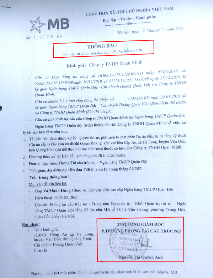 Và chỉ ít ngày sau khi Công ty Quan Minh từ chối đề xuất bán đất dự án Ocean Park với giá ưu đãi, ngay lập tức, MB Bank mà trực tiếp là bà Nguyễn Thị Quỳnh Anh đã thừa ủy quyền Tổng giám đốc Ngân hàng TMCP Quân Đội ký vào hàng loạt văn bản yêu cầu Công ty Quan Minh di dời ra khỏi tài sản bảo đảm, xử lý tài sản bảo đảm để thu hồi nợ xấu, trong khi Công ty Quan Minh đã trả nợ gốc và lãi vay trước hạn đối với tất cả khoản vay tại MB Bank.
