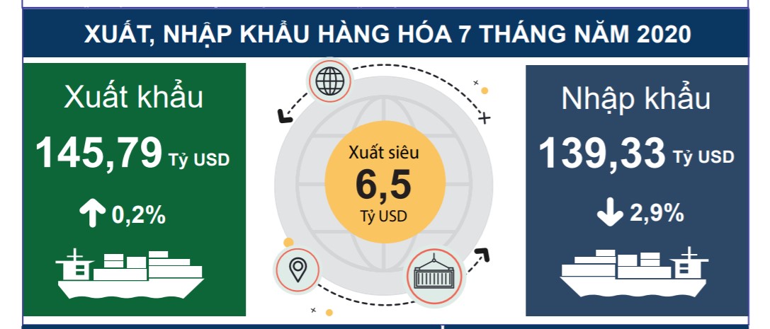 Dịch Covid-19 ngày càng lan nhanh trên thế giới, tiếp tục gây ảnh hưởng tiêu cực tới hoạt động xuất, nhập khẩu của Việt Nam. Tổng kim ngạch xuất, nhập khẩu hàng hóa 7 tháng năm 2020 ước tính đạt 285,12 tỷ USD, giảm 1,3% so với cùng kỳ năm trước, trong đó xuất khẩu đạt 145,79 tỷ USD, tăng nhẹ 0,2%; nhập khẩu đạt 139,33 tỷ USD, giảm 2,9%