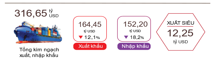Tính chung 6 tháng đầu năm 2023, cán cân thương mại hàng hóa ước tính xuất siêu 12,25 tỷ USD (cùng kỳ năm trước xuất siêu 1,2 tỷ USD). Trong đó, khu vực kinh tế trong nước nhập siêu 9,81 tỷ USD; khu vực có vốn đầu tư nước ngoài (kể cả dầu thô) xuất siêu 22,06 tỷ USD.