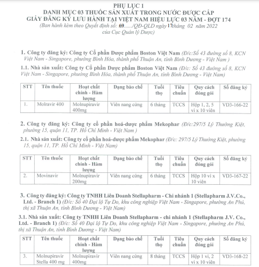 Ngày 17/2, Cục trưởng Cục Quản lý Dược (Bộ Y tế) vừa ký quyết định ban hành danh mục 3 loại thuốc chứa Molnupiravir sản xuất trong nước, được cấp giấy đăng ký lưu hành tại Việt Nam.