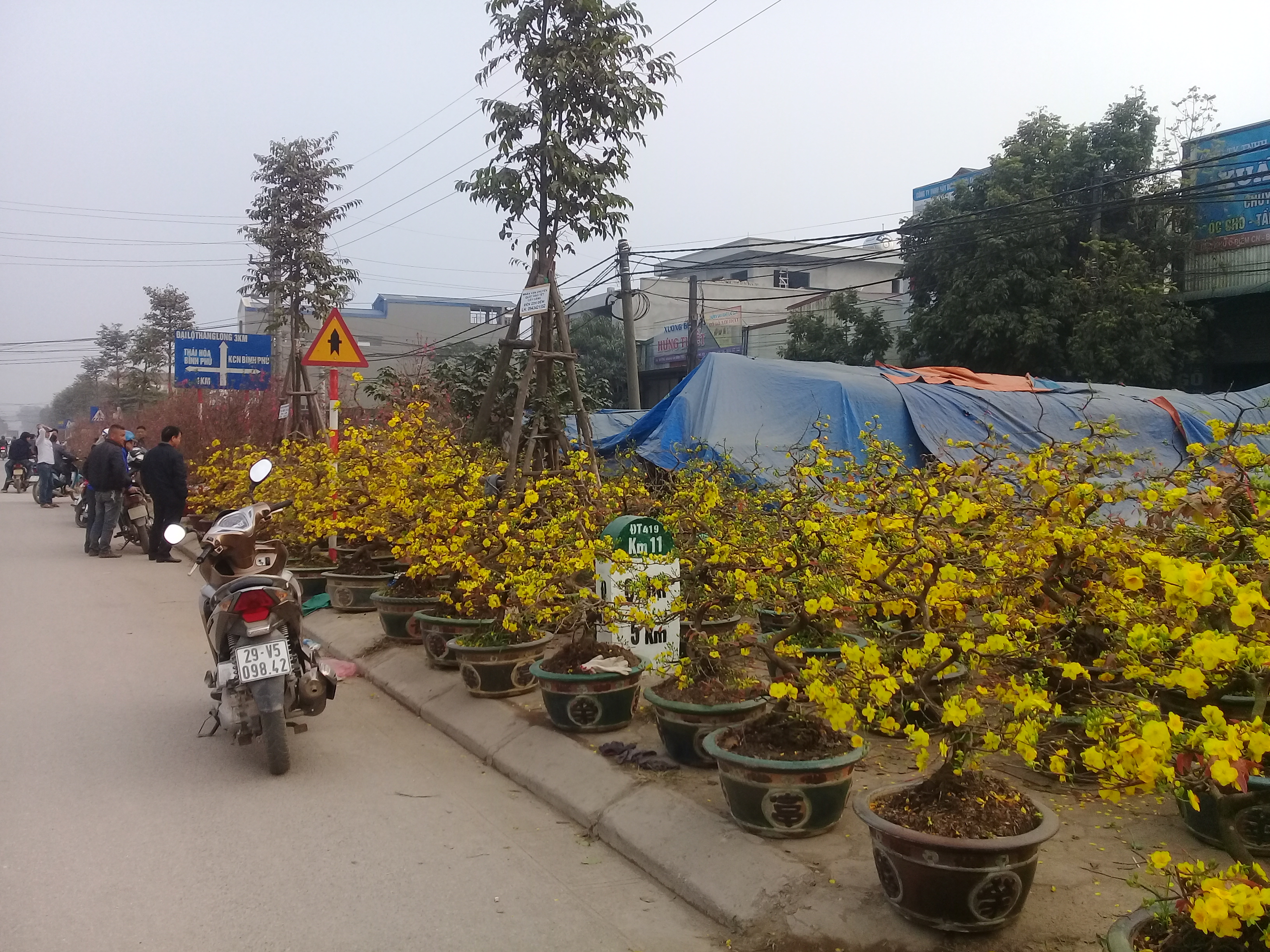 Theo ghi nhận của PV, trên một số tuyến đường đoạn từ Phùng Xá đến thị trấn Liên Quan (Thạch Thất, Hà Nội), đào, mai, quất đã được bày bán khá nhiều để phục vụ người dân đón Tết Nguyên đán Kỷ Hợi.