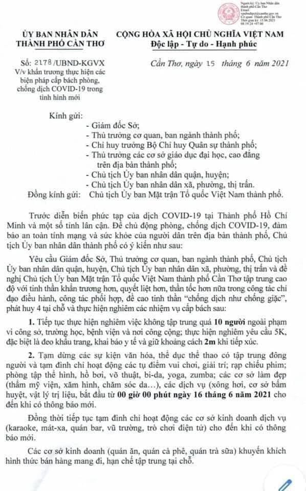 Ngày 15/6, Chủ tịch UBND TP Cần Thơ đã có văn bản gửi các cơ quan, đơn vị trên địa bàn yêu cầu tập trung cao độ với tinh thần khẩn trương hơn, quyết liệt hơn, thần tốc hơn nữa trong công tác chỉ đạo điều hành, công tác phối hợp, đề cao tinh thần “chống dịch như chống giặc”, phát huy 4 tại chỗ và thực hiện nghiêm các nhiệm vụ cấp bách.