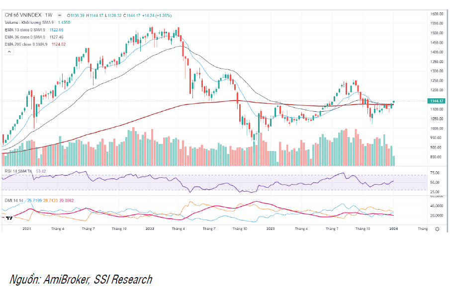 Về mặt phân tích kỹ thuật, VN-Index tiếp nối xu hướng với những tín hiệu khả quan hơn sau 2 tháng cuối năm 2023 tạo đáy và hồi phục. Việc tích lũy quanh vùng 1.076-1.130 điểm diễn ra chủ đạo trong tháng 12/2023, tạo nền tăng trưởng cho đầu năm 2024. Một số chỉ báo kỹ thuật đảo chiều và bước đầu quay trở lại tín hiệu tích cực ở trung hạn ủng hộ cho đà tăng của thị trường.
