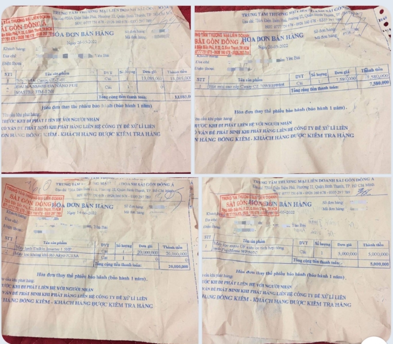 Anh T. cho biết, các sản phẩm trên đều được giao tới anh kèm theo Hóa đơn bán hàng của "Trung tâm thương mại liên doanh Sài Gòn Đông Á" địa chỉ 720A Điện Biên Phủ, phường 22, quận Bình Thanh, TP.HCM. Phương thức thanh toán là trả tiền trực tiếp cho người giao hàng.