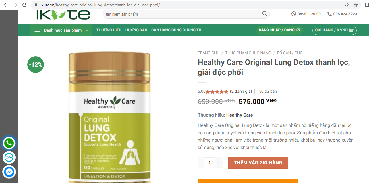 Theo tìm hiểu của phóng viên, tai website có địa chỉ https://ikute.vn/healthy-care-original-lung-detox-thanh-loc-giai-doc-phoi/, sản phẩm Healthy Care Original Lung Detox được giới thiệu là một sản phẩm nổi tiếng hàng đầu tại Úc có công dụng tuyệt vời trong việc thanh lọc phổi. Sản phẩm đặc biệt tốt cho những người phải làm việc trong môi trường nhiều khói bụi hay thường xuyên sử dụng, tiếp xúc với khói thuốc lá.